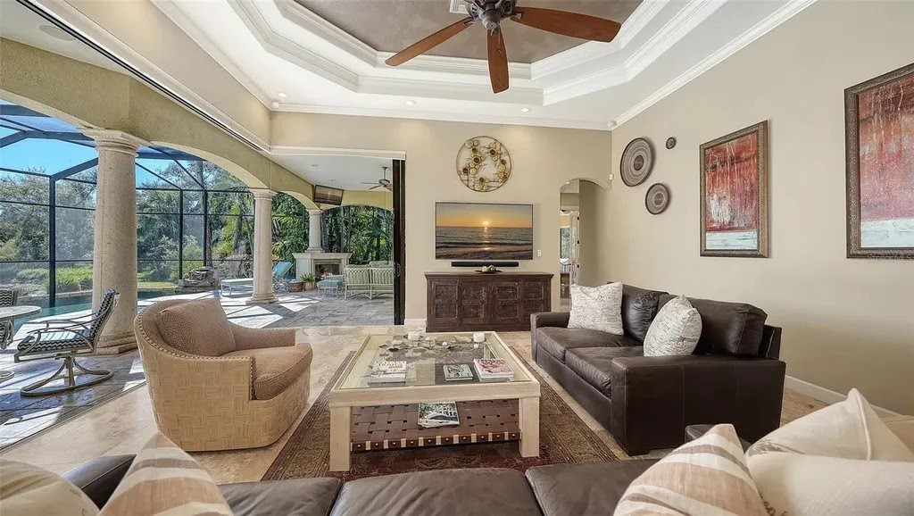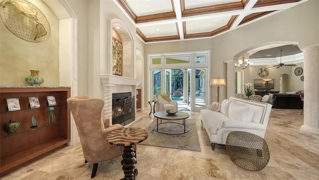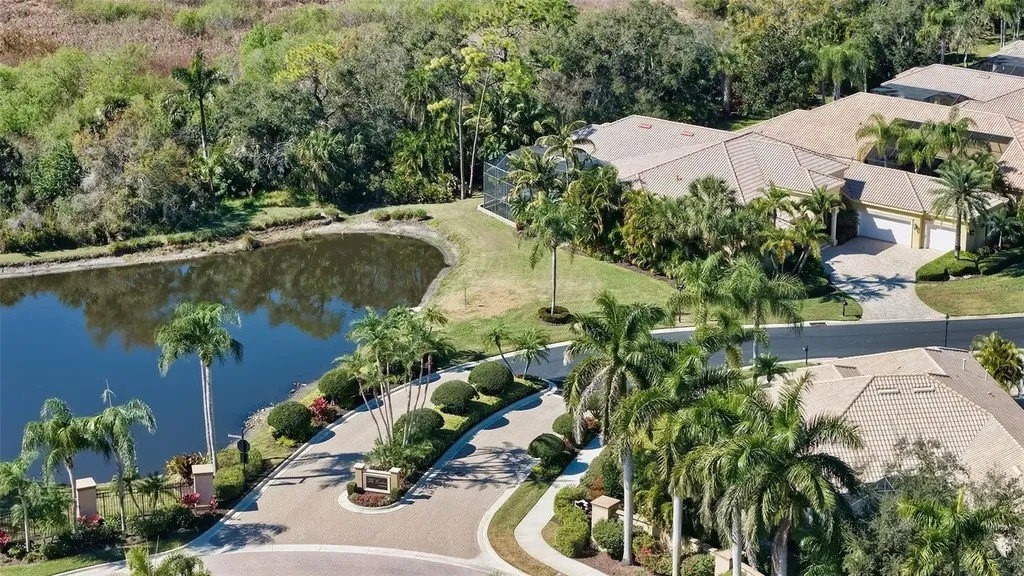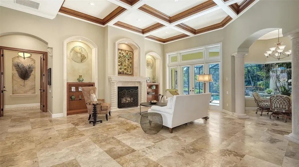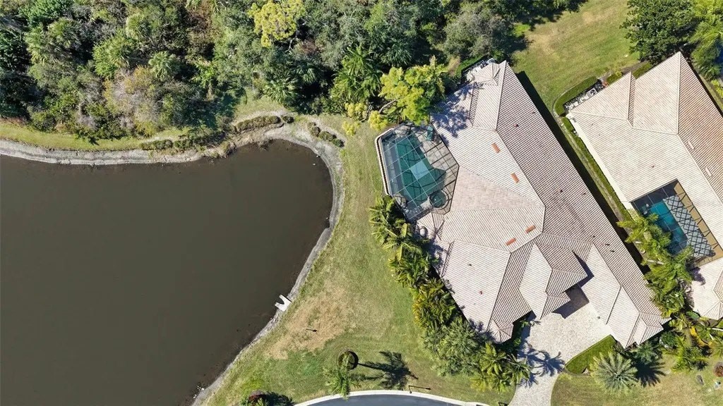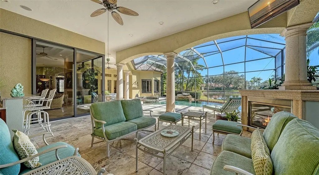 Stately custom residence located on a premier lakefront lot within The Enclave at Silver Oak, one of Palmer Ranch's popular communities. Originally built as a former model by Special Edition Custom Homes, the grand home reflects the highest quality of construction and architectural detail throughout. Welcoming covered entry with solid wood double doors and wrought iron open into soaring ceilings adorned with crown molding, rich trim work and tray and coffered ceiling designs. Large-format travertine stone flooring, 8-ft solid wood interior doors, custom-built closets in every bedroom, Hunter Douglas shades, and a surround sound system. Impressive open floor plan seamlessly connects elegant interior spaces with expansive outdoor living. Inviting living room with striking stone fireplace and built-ins and large French doors opening directly to the outdoor area. Entertaining is enhanced by a stylish wet bar, complete with beverage refrigerator, ice maker and custom wine cellar. A dedicated dining room is conveniently located adjacent to the living room and wet bar. Chef's gourmet kitchen showcases rich custom wood cabinetry with under-cabinet lighting, pull-out shelving/drawers, granite countertops, mosaic tile backsplash, and professional-grade KitchenAid appliances, including a six-burner gas range. Built-in planning center/desk, plus a breakfast nook with expansive aquarium window overlooking the pool and lake. The adjoining family room features floor-to-ceiling multi-panel sliding glass doors on 2 walls that open fully to the outdoors. Dedicated office with built-in desk system and powder bath for guests. The primary suite is a luxurious retreat with separate his-and-her custom closets and a spa-inspired bathroom with dual split vanities, ample granite counters and storage space, oversized soaking tub, large walk-in shower, and a private water closet with both a standard toilet and a standalone bidet. The split-bedroom floor plan ensures privacy, with two bedrooms sharing a Jack-and-Jill bathroom, along with two additional bedrooms (the 5th could be a flex/game room or 2nd office) and a full bath. A spacious laundry room provides direct access to the three-car side-entry garage with built-in storage. Outdoor living is exceptional, highlighted by a vanishing-edge pool with integrated spa and natural stone overflow, surrounded by expansive travertine decking. The fully equipped outdoor kitchen includes a gas grill, sink, and beverage refrigerator, while a large covered lounge area with custom-built stone fireplace creates the perfect setting for entertaining. Fully enclosed with a bronze screen and framed by lush Florida landscaping and serene lake views. Silver Oak is a 24-hour guard-gated community with no CDD fees and includes lawn maintenance. Ideally located in the heart of Palmer Ranch, just steps from the Legacy Trail and minutes from shopping, dining, golf, entertainment, and world-famous Siesta Key Beach. Please note, the structure is not in a flood zone, see notes from county and insurance company.