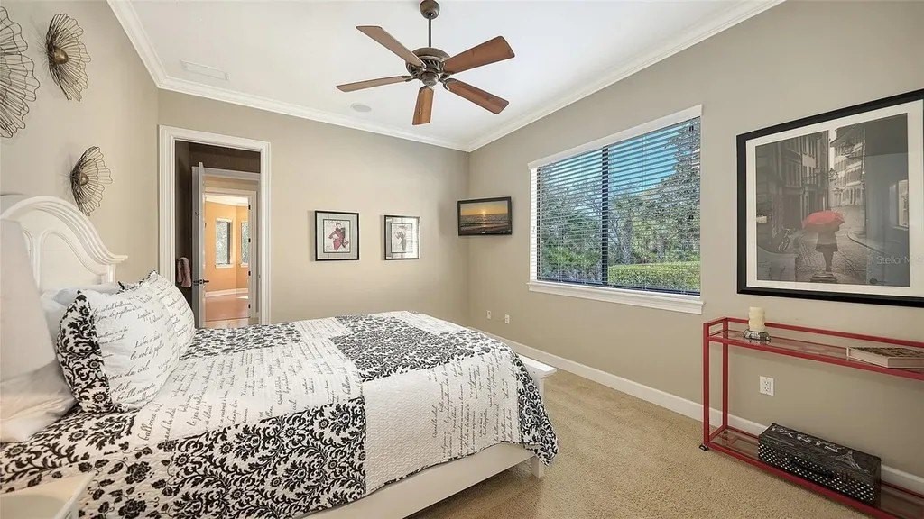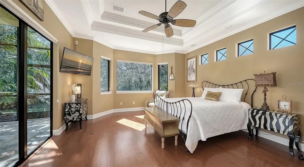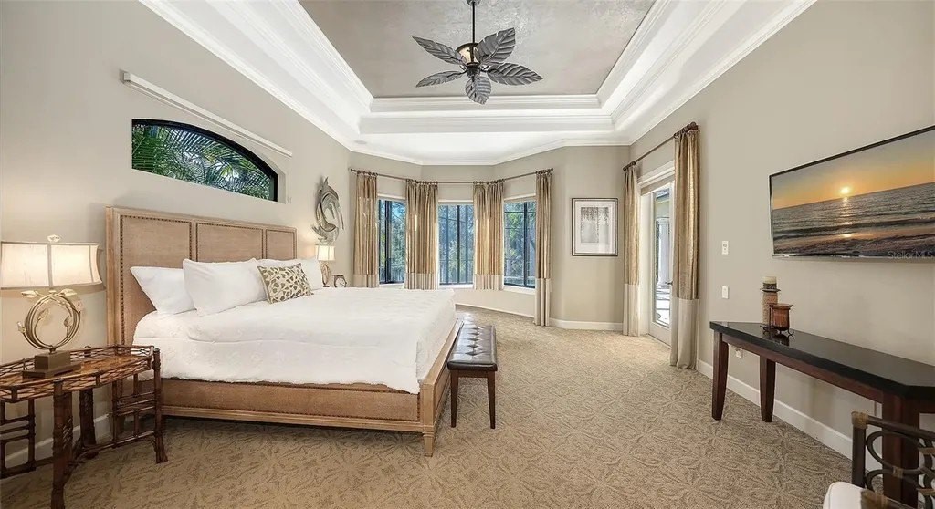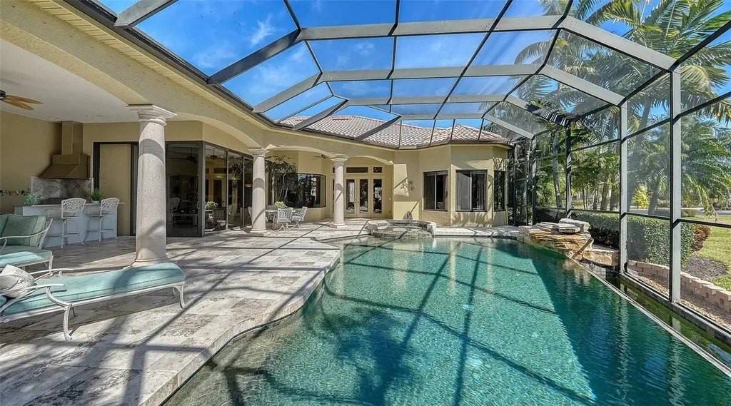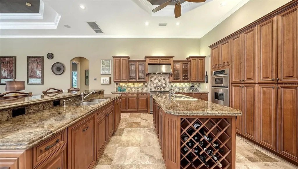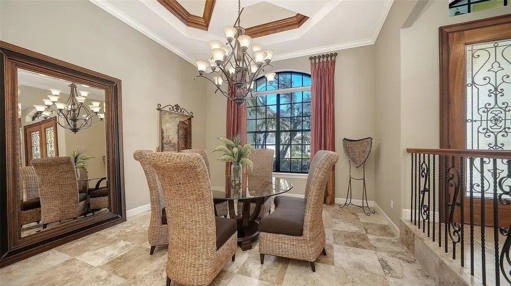 Stately custom residence located on a premier lakefront lot within The Enclave at Silver Oak, one of Palmer Ranch's popular communities. Originally built as a former model by Special Edition Custom Homes, the grand home reflects the highest quality of construction and architectural detail throughout. Welcoming covered entry with solid wood double doors and wrought iron open into soaring ceilings adorned with crown molding, rich trim work and tray and coffered ceiling designs. Large-format travertine stone flooring, 8-ft solid wood interior doors, custom-built closets in every bedroom, Hunter Douglas shades, and a surround sound system. Impressive open floor plan seamlessly connects elegant interior spaces with expansive outdoor living. Inviting living room with striking stone fireplace and built-ins and large French doors opening directly to the outdoor area. Entertaining is enhanced by a stylish wet bar, complete with beverage refrigerator, ice maker and custom wine cellar. A dedicated dining room is conveniently located adjacent to the living room and wet bar. Chef's gourmet kitchen showcases rich custom wood cabinetry with under-cabinet lighting, pull-out shelving/drawers, granite countertops, mosaic tile backsplash, and professional-grade KitchenAid appliances, including a six-burner gas range. Built-in planning center/desk, plus a breakfast nook with expansive aquarium window overlooking the pool and lake. The adjoining family room features floor-to-ceiling multi-panel sliding glass doors on 2 walls that open fully to the outdoors. Dedicated office with built-in desk system and powder bath for guests. The primary suite is a luxurious retreat with separate his-and-her custom closets and a spa-inspired bathroom with dual split vanities, ample granite counters and storage space, oversized soaking tub, large walk-in shower, and a private water closet with both a standard toilet and a standalone bidet. The split-bedroom floor plan ensures privacy, with two bedrooms sharing a Jack-and-Jill bathroom, along with two additional bedrooms (the 5th could be a flex/game room or 2nd office) and a full bath. A spacious laundry room provides direct access to the three-car side-entry garage with built-in storage. Outdoor living is exceptional, highlighted by a vanishing-edge pool with integrated spa and natural stone overflow, surrounded by expansive travertine decking. The fully equipped outdoor kitchen includes a gas grill, sink, and beverage refrigerator, while a large covered lounge area with custom-built stone fireplace creates the perfect setting for entertaining. Fully enclosed with a bronze screen and framed by lush Florida landscaping and serene lake views. Silver Oak is a 24-hour guard-gated community with no CDD fees and includes lawn maintenance. Ideally located in the heart of Palmer Ranch, just steps from the Legacy Trail and minutes from shopping, dining, golf, entertainment, and world-famous Siesta Key Beach. Please note, the structure is not in a flood zone, see notes from county and insurance company.